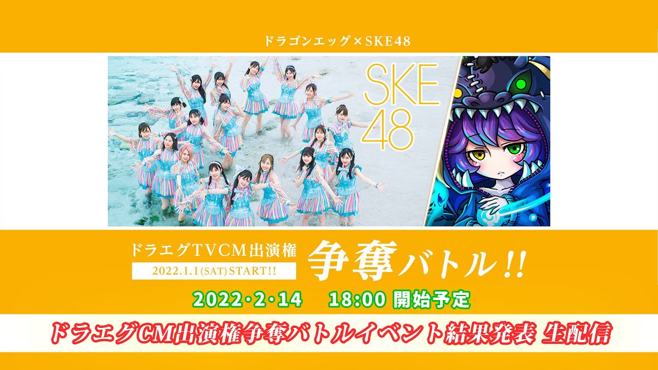 CELEBRITY ドラゴンエッグ×SKE48 コラボ TVCM出演権争奪バトルイベント 結果発表 生配信 2022-02-14 1月1日(土)から2月13日(日)まで、友達対戦RPGゲームアプリ「ドラゴンエッグ」とコラボした「ドラゴンエッグ×SKE48コラボTVCM 出演権争奪バトルイベント」の結果発表をSKE48 YouTube公式アカウントにて配信させていただくことになりました。 配信日/2022年2月14日(月) 開始時間/18:00〜 出演/大場美奈(ドラゴンエッグ×SKE48スペシャルサポーター) #SKE48 #大場美奈