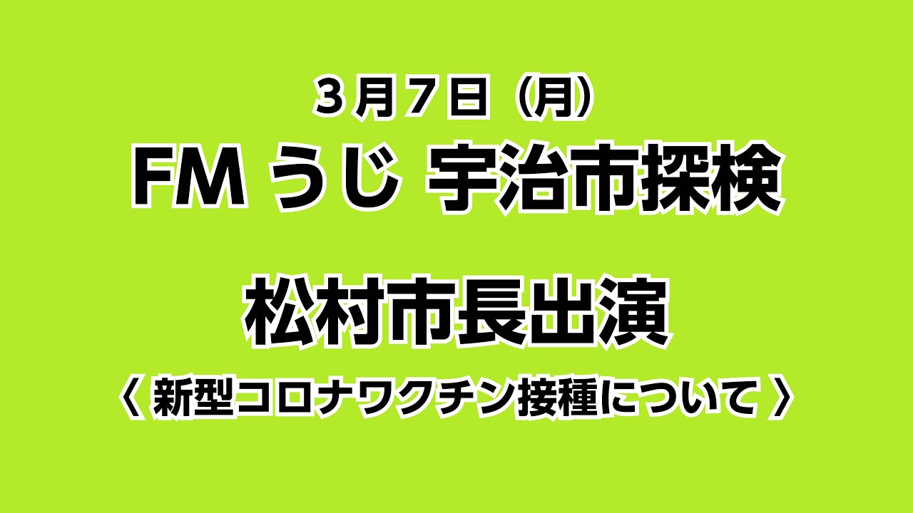 令和4年3月7日(月)、FMうじ『宇治市探検』に松村市長が出演し、新型コロナワクチン接種について話しました。主な内容 ・ワクチンの3回目接種 ・5~11歳の子どものワクチン接種 ・まん延防止等重点措置の延長(問い合わせ先) 宇治市新型コロナウイルス感染症対策本部 0774-22-3141 宇治市新型コロナウイルス感染症