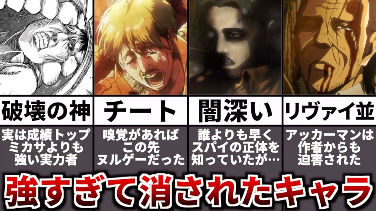 今回は、最強すぎて消されてしまったキャラを紹介していきました! やはりチートキャラはかっこいいですが、消されてしまうのは悲しいですね!参考資料&引用 ©諫山創・講談社/「進撃の巨人」The Final Season製作委員会 ※動画内で使用している全ての画像は上記の作品からの引用させていただいております。 #進撃の巨人 #ファイナルシーズン #The Final Season Part2 #考察 #進撃の巨人The Final Seasonエレンファイナルシーズンライナーリヴァイ巨人考察解説進撃の巨人 The Final Season Part 2