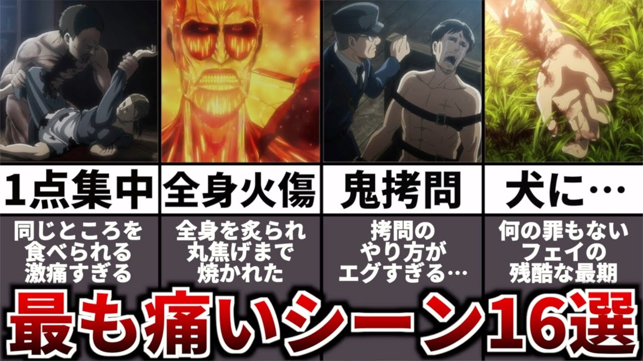今回は、肉体的に痛かったシーンをランキング形式で紹介していきました!みなさんは、どれが最も痛いと思いましたか? 参考資料&引用 ©諫山創・講談社/「進撃の巨人」The Final Season製作委員会 ※動画内で使用している全ての画像は上記の作品からの引用させていただいております。#進撃の巨人 #ファイナルシーズン #The Final Season Part2 #考察 #進撃の巨人The Final Seasonエレンファイナルシーズンライナーリヴァイ巨人考察解説進撃の巨人 The Final Season Part 2