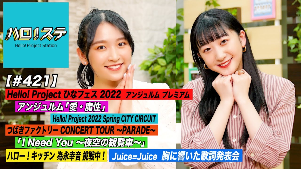 4月2日・3日に開催された「Hello! Project ひなフェス 2022」からアンジュルム「愛・魔性」のLIVEパフォーマンスを公開!そして、現在開催中の「Hello! Project 2022 Spring CITY CIRCUIT」からつばきファクトリーの「I Need You ~夜空の観覧車~」をお届け!ハロー!キッチンは為永幸音が「ささみ料理と筍ご飯」に挑戦中!「胸に響いた歌詞発表会」は井上玲音があの曲を紹介します! MCはつばきファクトリー 小野瑞歩と秋山眞緒