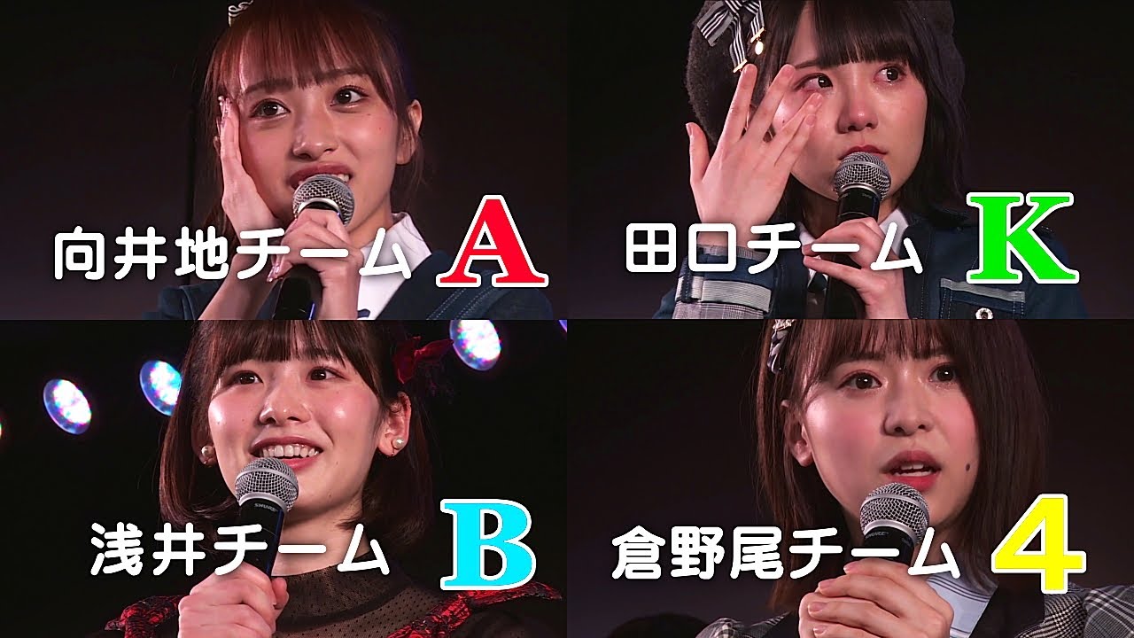 【田口チームK】市川愛美、上見天乃、大西桃香、奥原妃奈子、奥本陽菜、小田えりな、久保怜音、小林蘭、下口ひなな、髙橋彩音、田口愛佳、服部有菜、濵咲友菜、宮崎美穂、武藤十夢、茂木忍、安田叶、山内瑞葵、山根涼羽、山邊歩夢、湯本亜美