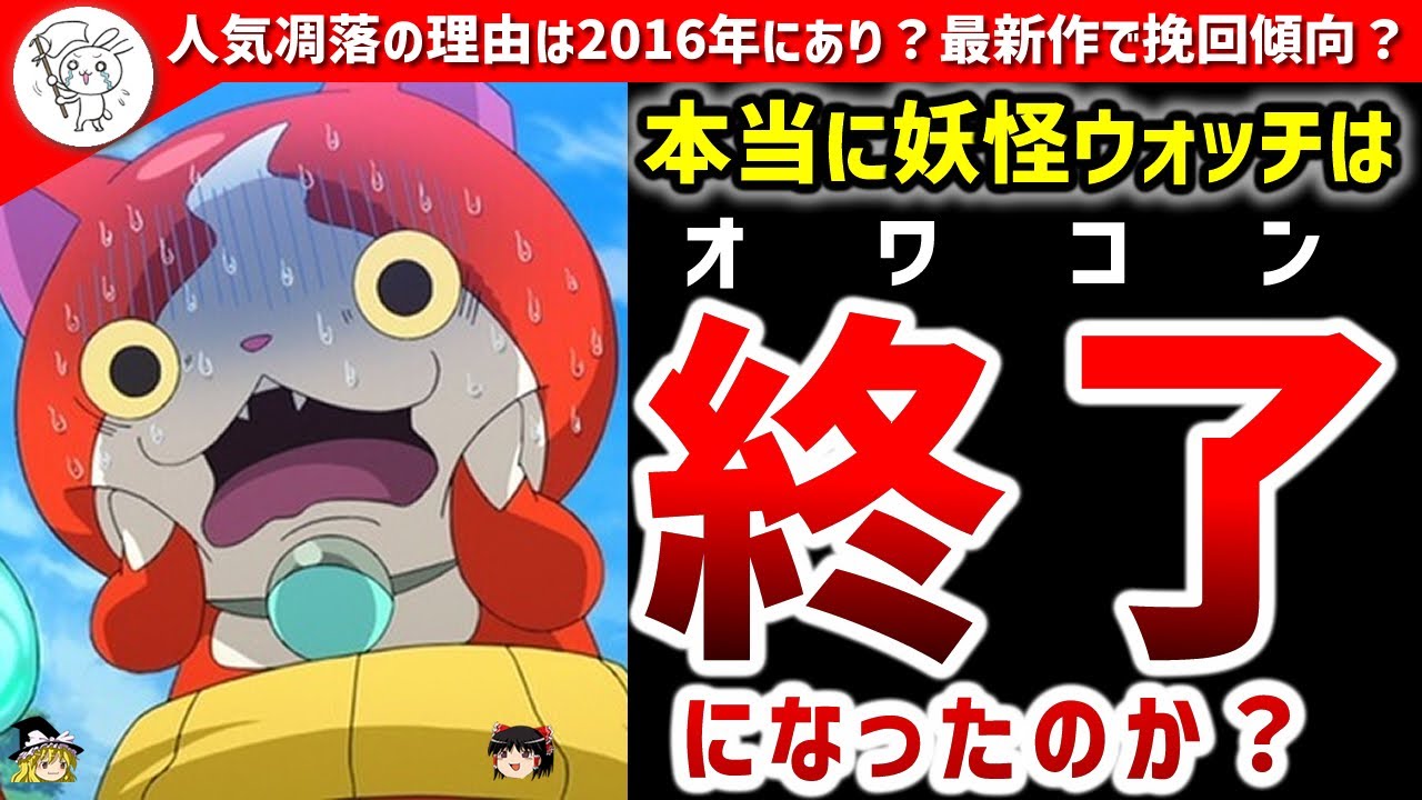 『第二のポケモン』とまでいわれ、社会現象にまでなり大ヒットした『妖怪ウォッチ』はなぜここまで人気が廃れてしまったのでしょうか?「妖怪ウォッチはオワコン、失敗、廃れた、終わった、人気が完全になくなった」とまでいう人もいますが、本当にそうなのでしょうか?人気凋落の鍵はどうやら2015~16年あたりの出来事にありそうです。また、最新作のアニメは視聴率回復傾向にあり、昔のファンが戻ってきている可能性もありますので、その辺りについても言及しております。