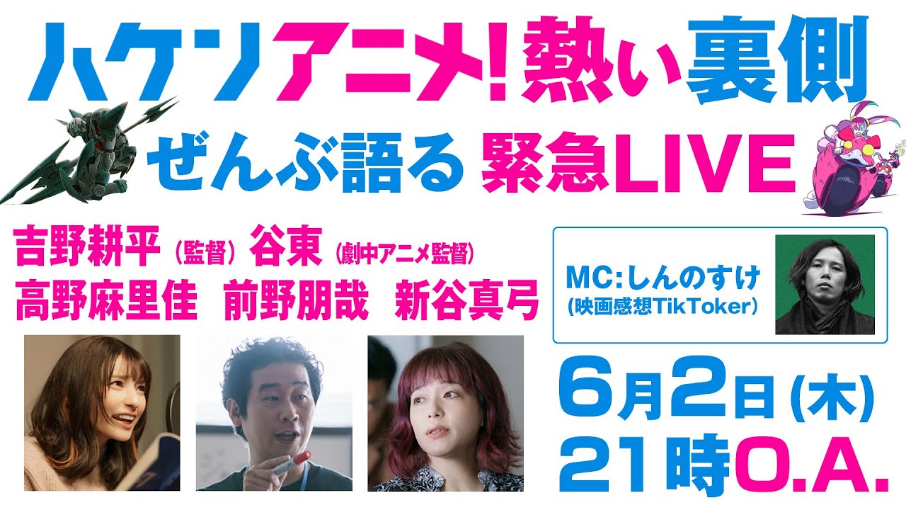 スペシャルゲストに、吉野耕平監督、劇中アニメ「サウンドバック」の監督を務めた谷東監督、そして声優・群野葵役の高野麻里佳さん、制作デスク・根岸役の前野朋哉さん、編集・白井役の新谷真弓さんをお迎え!本作の魅力はもちろんのこと、映画の本編映像を振り返りながら、熱すぎる製作の裏側や想いを存分に語っていただきます。