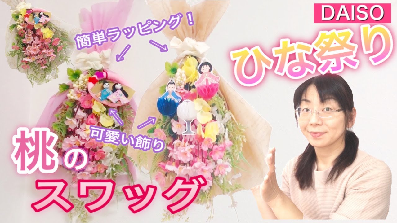 今回は、ダイソーの桃の花🌸で雛飾りをスワッグに。