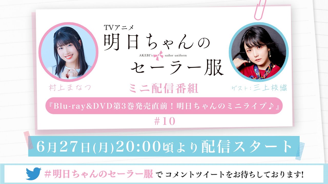 YouTubeライブのチャットおよびTwitterではハッシュタグ「#明日ちゃんのセーラー服」を付けたツイートで、ご感想や番組へのコメント、ご質問などお待ちしております!