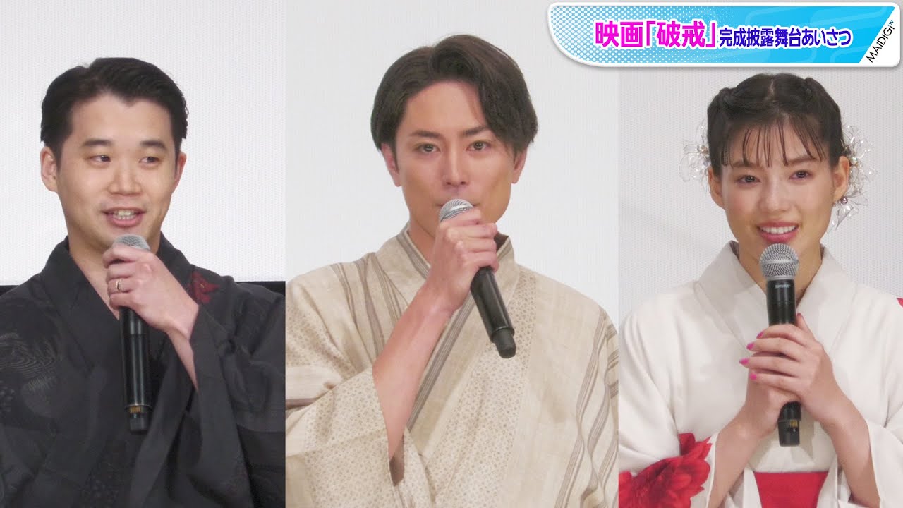 俳優の間宮祥太朗さん、矢本悠馬さん、女優の石井杏奈さんが6月13日、東京都内で行われた映画「破戒」(前田和男監督、7月8日公開)の完成披露舞台あいさつに登場。涼やかな浴衣姿を披露した。