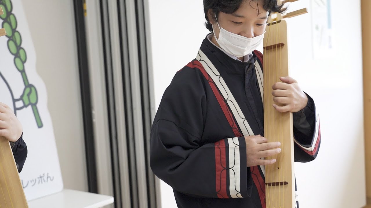 ウポポイが臨時休業中のなか、職員は日々研鑽を積んでいます。この日、体験学習館で行われていたのはアイヌ楽器演奏の練習。 先輩職員の指導のもと、音やリズムを確認しながら繰り返し練習します。 upopoiアイヌモシㇼ