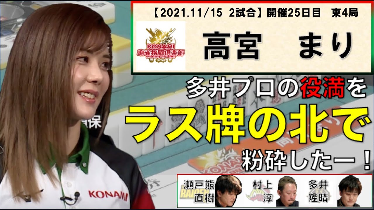 【 2021.11/15 第2試合 開幕25日目 東4局】KONAMI麻雀格闘倶楽部 高宮まり選手の和了場面になります。