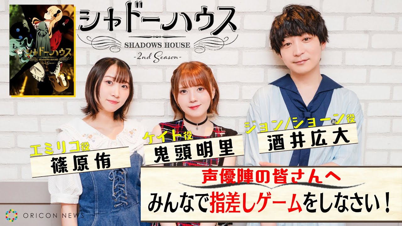 TVアニメ『シャドーハウス』2nd Seasonでキャラクターを演じている声優陣が登場。ケイト役の鬼頭明里、エミリコ役の篠原侑、そしてジョン/ショーン役の酒井広大が「指差しゲーム」をテーマにフリートークを展開。声優陣が普段見せない、素の部分を垣間見せてくれた。