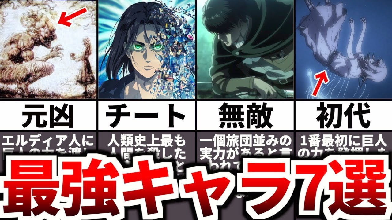 今回は進撃の巨人の最強キャラを7人紹介していきました!みなさんは、どのキャラが最も最強だと思いますか? コメント欄で教えてください! 参考資料&引用 ©諫山創・講談社/「進撃の巨人」The Final Season製作委員会 ※動画内で使用している全ての画像は上記の作品からの引用させていただいております。#進撃の巨人 #ファイナルシーズン #The Final Season Part2 #考察 #進撃の巨人The Final Seasonエレンファイナルシーズンライナーリヴァイ巨人考察解説進撃の巨人 The Final Season Part 2