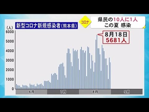 新型コロナウイルス、8月は月間の感染者数が初めて10万人を超えました。7月と合わせるとおよそ18万人となり県民のおよそ10人に1人がこの2カ月間に感染したことになります。1日ごとの感染者の推移を見ると8月18日の5681人をピークに減少に転じていて猛威を振るった第7波は収束に向かっているようにも見えますが依然として第6波のピークよりも高い状態は続いています。引き続き基本的な感染対策の徹底が求められます。 コロナ感染者今日感染者新型コロナ熊本県