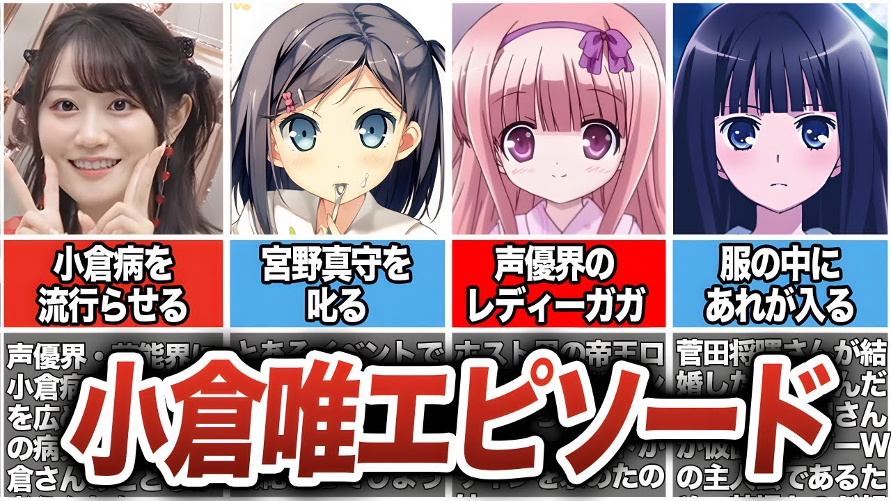声優のゆっくり解説動画を投稿してます!ぜひチャンネル登録・高評価の方お願いします。■著作権 動画内で使用する画像等の著作権は、全て権利者の方に帰属します。 [著作権法]に基づき、引用した画像等については、動画説明欄に引用元を記載しております。著作権を侵害する目的は一切ございません。 権利者の方で、お気づきの点は、コメントくださいますようよろしくお願い致します。 アニメエピソード声優小倉唯経歴