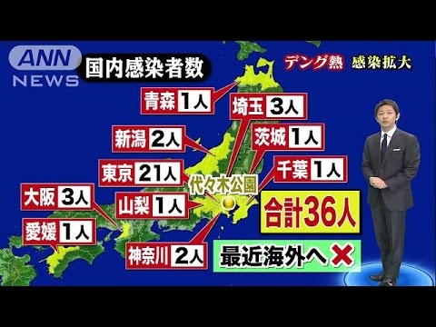 デング熱の感染がさらに広がりを見せています。青森や大阪などでも新たな感染者が確認され、合わせて36人になりました。いずれも最近の海外渡航歴はなく、全員が代々木公園やその周辺を訪れていました。東京都は3日午前、公園内に設置していた蚊を採取する装置を回収しました。 ・・・記事の続き、その他のニュースはコチラから! [テレ朝news] http://www.tv-asahi.co.jp/ann/ ANNNewsTV ASAHItvasahiウイルステレビ朝日テレ朝デング熱ニュース代々木公園古賀康之平石直之感染感染者採取東京都海外渡航歴紗綾