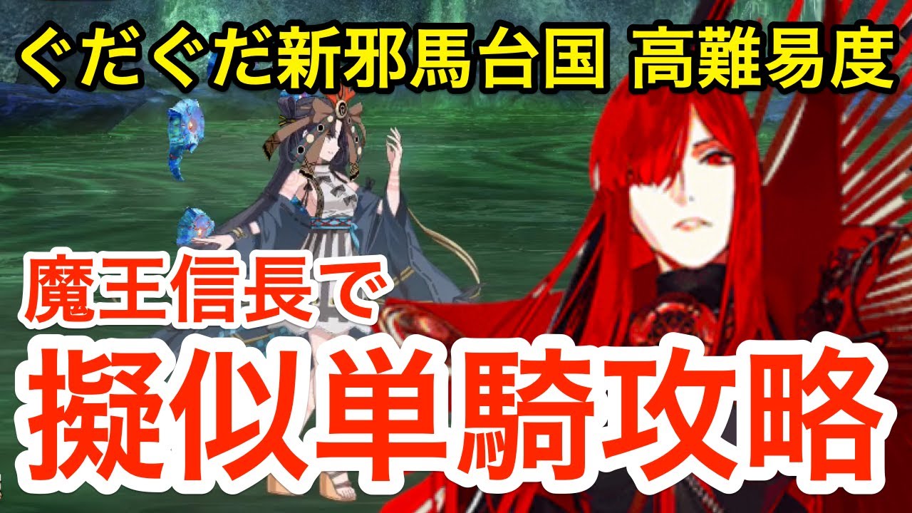 ぐだぐだ新邪馬台国 高難易度「ぶっちぎり開運バトル 立てよ茶柱」を擬似単騎クリア。防御無視礼装やコードを付ければ敵の耐性がある間もHPを削れます。動画ではイベ特攻+B3枚で火力を出し易い魔王信長を採用。