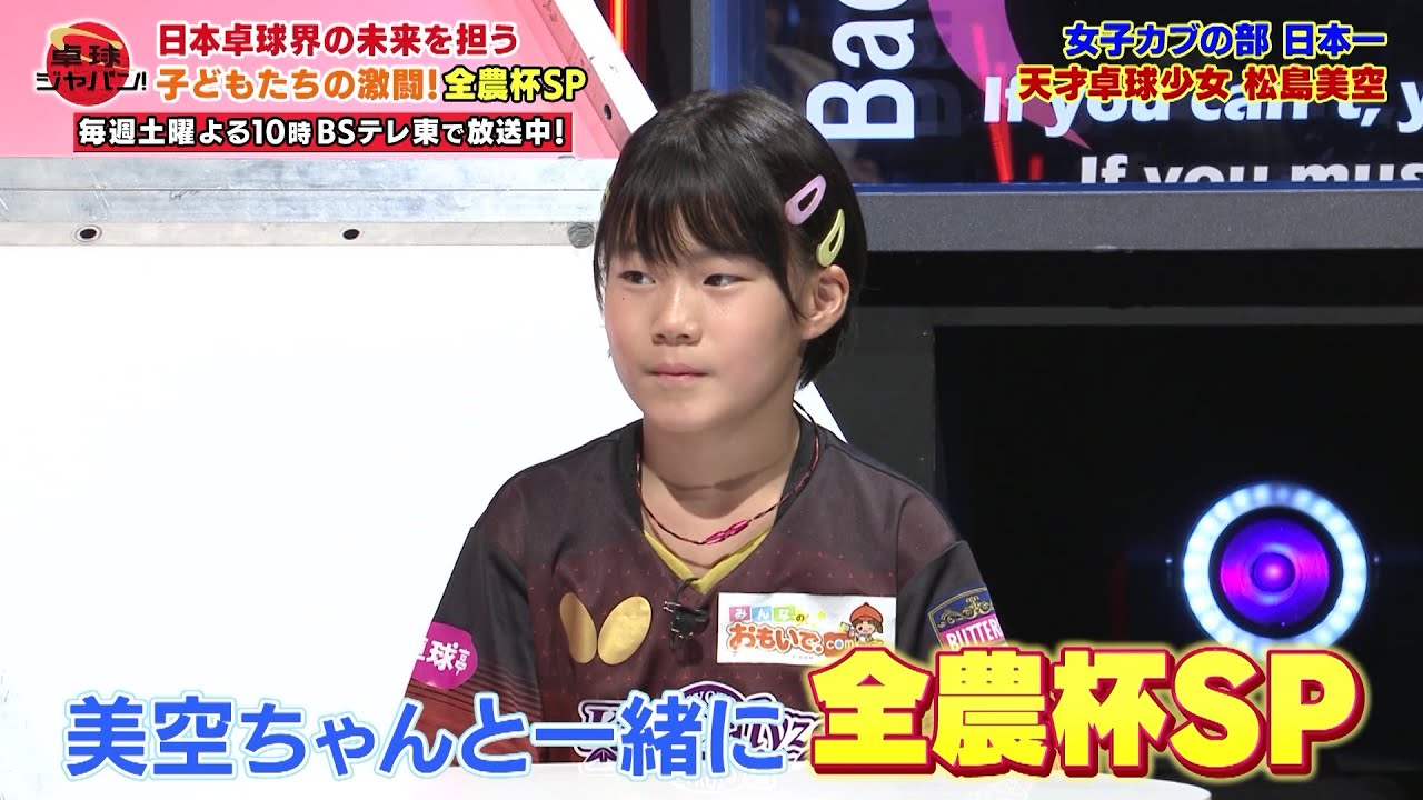 番組が注目したのは、8歳で京都カグヤライズのTリーガーとなった松島美空選手(9歳)。昨年バンビ(小学1、2年生)の部で優勝し、今年はカブの部で大会2連覇へ挑みます。1学年上の4年生には、お母さんは元オリンピック選手、お父さんは世界卓球メダリストという卓球界注目のライバルも。さらに、あの名選手の懐かしい映像も!!小学生ひと夏の熱き熱き戦い「全農杯」を大特集します。