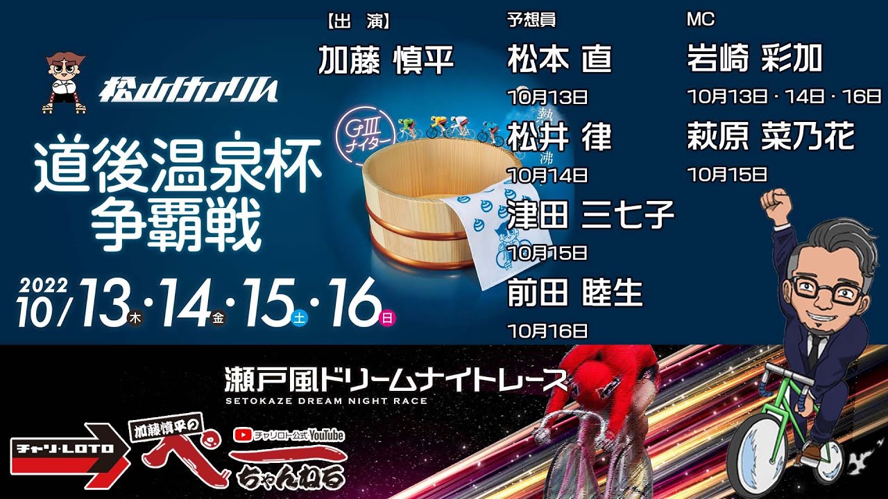 当チャンネルは株式会社チャリロトの競輪専属解説員でもある加藤慎平さんが中心となって、記念競輪やその他の競輪レースをより深く、より楽しくお送りする番組です。