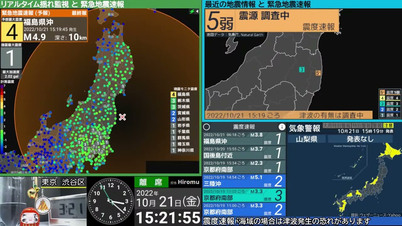 地震速報ライブ(短縮URL) https://bit.ly/3c7YQ1R0:00 切り抜きアーカイブ 0:02 揺れ検知 0:04 緊急地震速報 (予報) 1:32 震度速報 3:35 震源情報 (津波の心配なし) 4:00 各地の震度情報 (詳細)福島県沖 震度5弱 M5.1 深さ30km 2022/10/21 15:19ごろ 23区5弱5強6弱6強EarthquakejdqJMAJQuakekiwiLIVENewsPGATsunamiアーカイブいまごろつなみトカラニュースプレートマグニチュードみやすいモニタゆれライブライブ地震速報三陸二十三区今付近仙台北海道台風地方地震地震 ライブ地震ライブ地震ライブ配信中地震情報地震最新情報地震速報地震速報 ライブ大津波大津波警報宮城小笠原岩手巨大強震強震モニタ情報振動揺れ放送日本最大最近棒読み気象庁沖縄津波津波情報津波注意津波注意報津波警報海外海岸深さ深層深発災害琴葉発表監視福島緊急緊急地震速報緊急地震速報ライブ群発自作自然見やすい規模観測計測誘発読み上げ近海通り速報連発進路遠地配信開発雨震央震度震度3震度4震度7震源震源情報青森