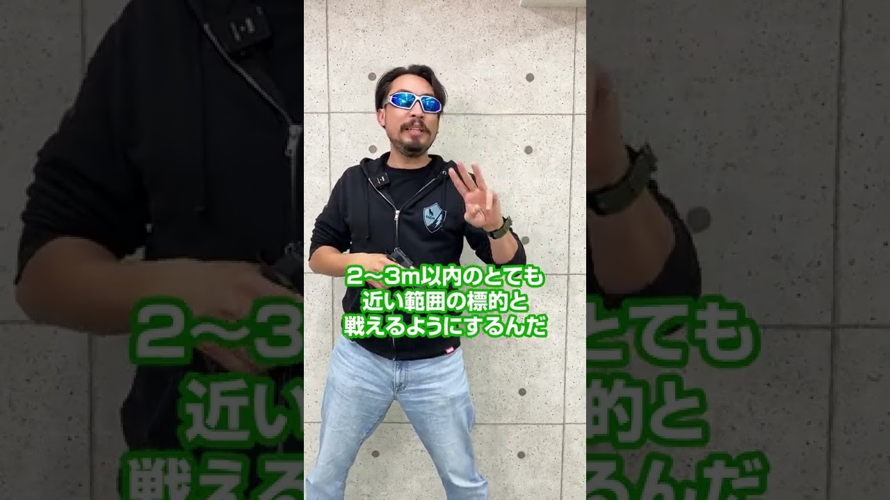 利き手で銃を構え、出来るだけ身体に銃を近づける形で構えます。サイティングを効き目と反対の目で行うことで効き目の方で広い視野を保てるのだそうです。