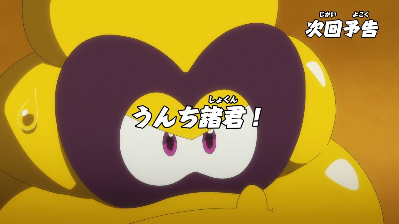 サバイバルバトルをするバートンたち。超巨大ガムウェポンを出したカッペイとバーンの攻撃がぶつかり合うと、突然、その場にいた全員がうんちの姿に!