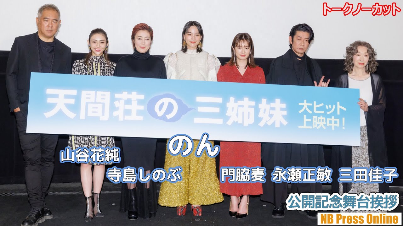 (見どころ頭出しあり)2022年10月29日、新宿バルト9にて、映画『天間荘の三姉妹』公開記念舞台挨拶が行われ、のん、門脇麦、山谷花純、三田佳子、永瀬正敏、寺島しのぶ、北村龍平監督が登壇。また大島優子はビデオメッセージでの参加となった。