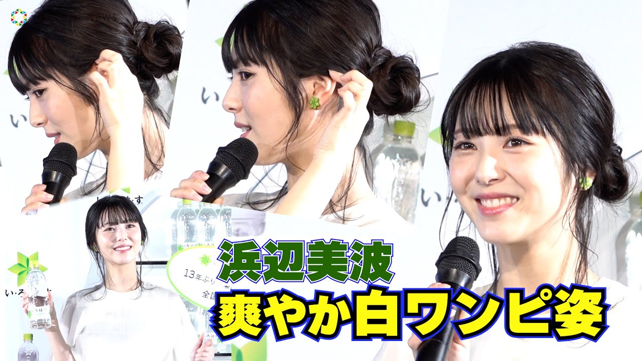 発表会に白いワンピース姿で登壇した浜辺は、衣装について「ボトルがリニューアルされるということで、天然水の透明感を衣装でも表現できたらいいなと思って」と説明。「CMでも着用させていただいたんですが、「い・ろ・は・す」のマークを使ったイヤリングも着けさせていただいているんです」とアピールした。