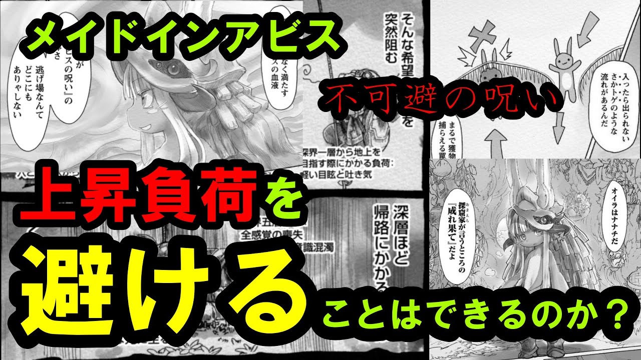 アビスを探窟するうえで必ず付きまとってくる「上昇負荷」という問題。人間な以上はほとんど不可避な呪いと呼ぶに相応しい代物ですが、果たしてそれを回避する方法はないのでしょうか。今回は実際に作中に登場した回避方法や「これなら回避できるのでは」といった妄想含めて動画にしていこうと思います。思います!こっちでした。