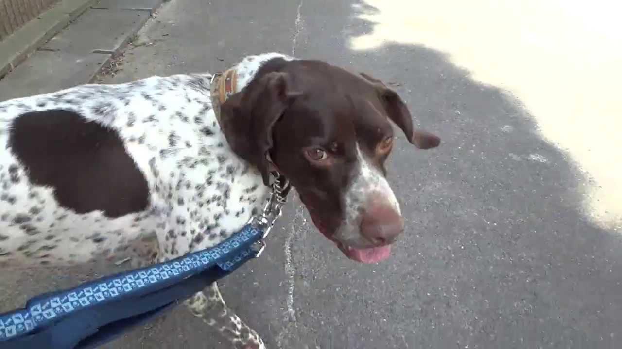カメラを追いかけてきてくれたポインターの男の子 オクトーくん。穏やかなお顔をして、脚側でおやつ待ち〜(笑)。
