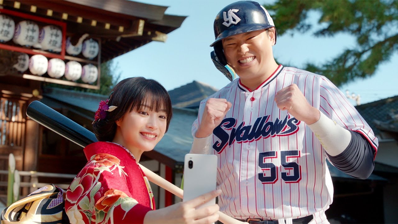 新年を迎えたばかりのとある神社。晴れ着姿の広瀬さんが初詣の参拝中、ご本尊の“村神様”こと村上選手と遭遇する。バットを手に、ユニホーム姿で境内に降臨した村上選手は、広瀬さんが放った幸せボールを、豪快なスイングで打ち返す。無数に分かれたボールが上空の雲を突き抜けて、あちこちに飛んでいき、そのうちの一つを別の場所で餅つきをしていた羽織はかま姿の横浜さんが見事にキャッチする……というストーリー。むちゃぶりをする広瀬さん、横浜さんと、まんざらでもない表情でそのむちゃぶりを受ける村上選手のコミカルな掛け合いも注目だ。