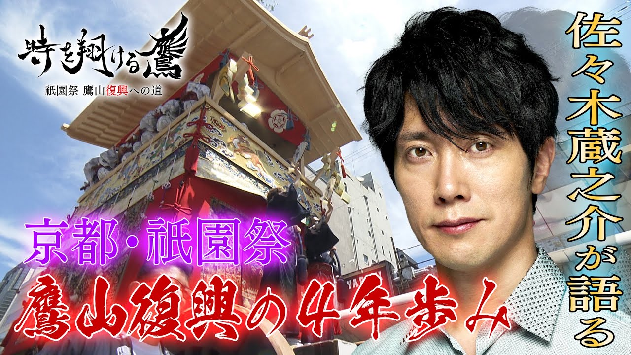 語り・佐々木蔵之介さんのコメント「京都で生まれ育った私にとって子供の頃、一年で一番ワクワクするのは祇園祭でした。宵山に歩行者天国の露店を練り歩き、翌日の山鉾巡行を見届けたら、もう夏休みは目の前!五山送り火や地蔵盆が待ち構えています。今年は、3年振りの祇園祭・山鉾巡行を、間近で体感する事が叶いました。そして、この番組で、鷹山の町衆の方たちの4年近くを追った映像を拝見しました。1100年にわたる祭りを継承する責任と覚悟と尊さに心打たれました。196年ぶりに蘇る鷹山の復興にかける夢と挑戦、是非ご覧ください」