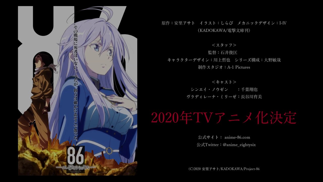 “その戦場に死者はいない”――だが、彼らは確かにあそこで散った。「86 -エイティシックス-」2020年TVアニメ化決定 ◇STAFF 原作:安里アサト イラスト:しらび メカニックデザイン:Ⅰ-Ⅳ (KADOKAWA/電撃文庫刊)監督:石井俊匡 キャラクターデザイン:川上哲也 シリーズ構成:大野敏哉制作スタジオ:A-1 Pictures◇CAST シンエイ・ノウゼン:千葉翔也 ヴラディレーナ・ミリーゼ:長谷川育実 8686―エイティシックス―A-1 PicturesⅠ-ⅣKADOKAWAエイティシックスしらび千葉翔也大野敏哉安里アサト川上哲也石井俊匡長谷川育実電撃文庫