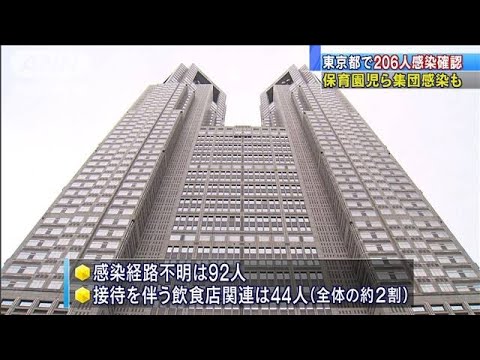 東京都によりますと、感染者206人のうち92人は感染経路が分かっていません。夜の繁華街の接待を伴う飲食店の従業員や客は44人で、全体の約2割でした。5日まで新宿区内の劇場で上演していた舞台を巡っては関係者20人の陽性が判明していますが、12日に新たに客ら5人の感染が確認されました。また、文京区立の保育園でも集団感染が起きていて、園児11人や保護者、保育士ら合わせて16人の感染が明らかになりました。この保育園では11日までに9人が陽性になっていて、感染者は園児19人を含む25人になりました。