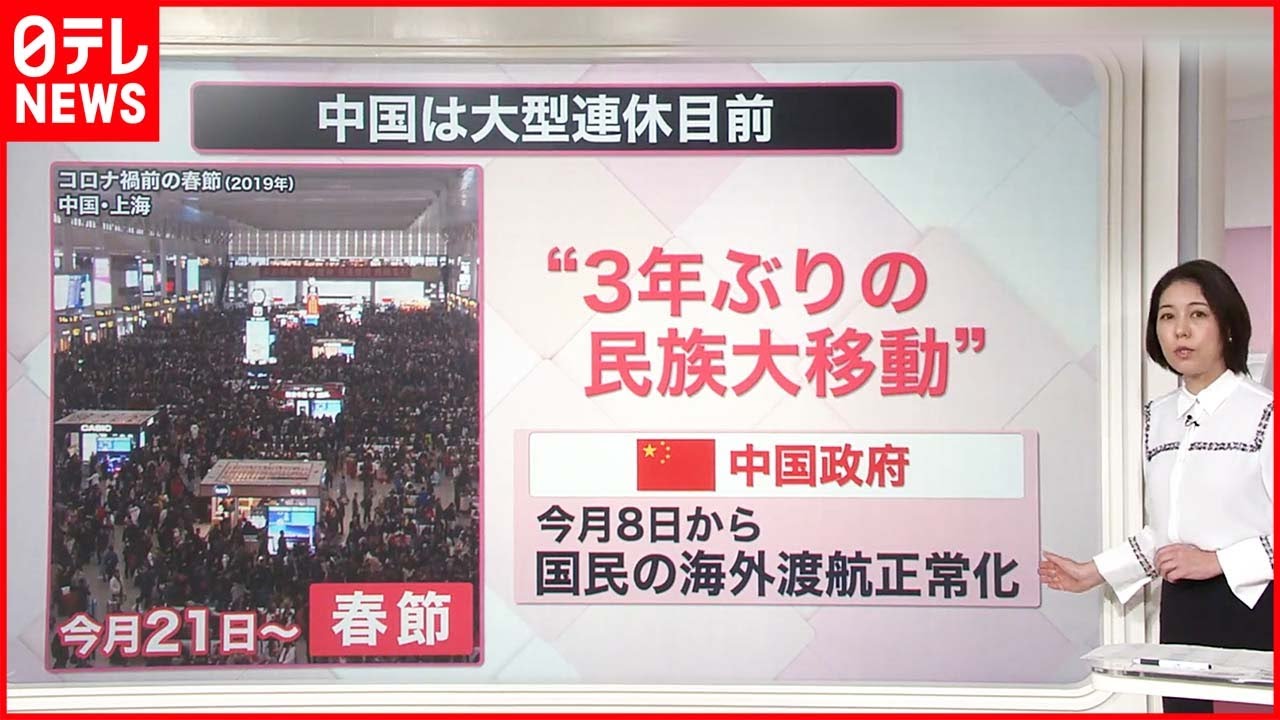 こうした状況の中、中国では1月21日から旧正月の「春節」にあわせた大型連休を控えています。中国国内では、“3年ぶりの民族大移動”が起こるとみられています。中国政府は1月8日から国民の海外渡航を正常化させる方針を打ち出していることから、日本にもこの時期、多くの中国人が訪れるとみられています。