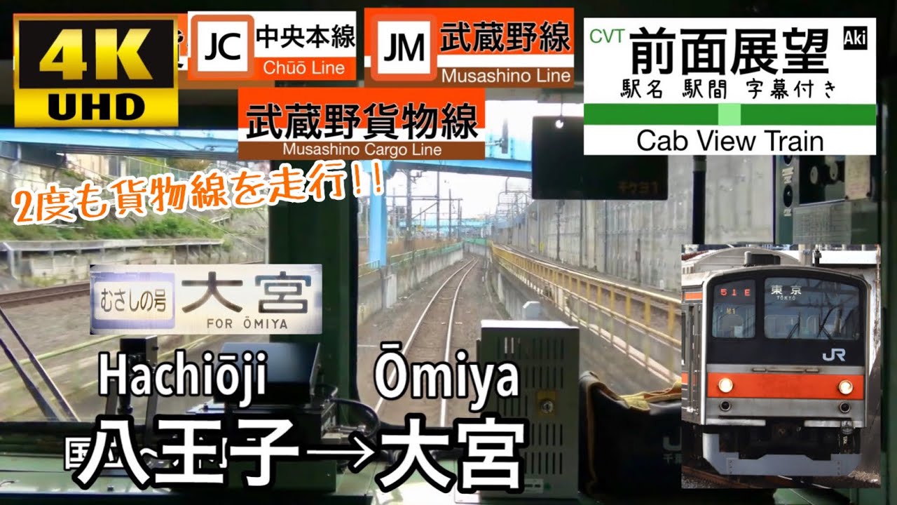 八王子駅始発のむさしの号は、中央本線や国立駅 – 新小平駅間と西浦和駅 – 大宮間の2箇所の貨物線を走行するため、通常の旅客列車と違い貨物列車のようなルートを走行します。そのため中々面白い前面展望になっているかと思います。