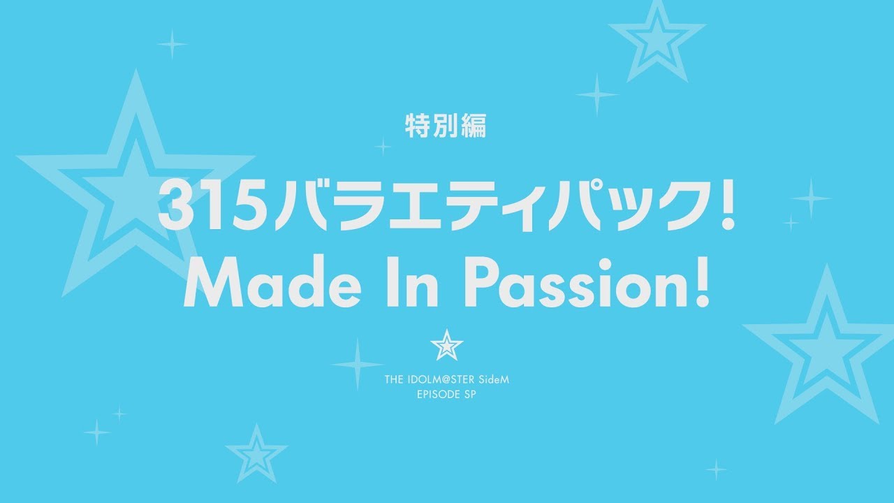 http://imas-sidem.com/TV未放送特別編「315バラエティパック! Made In Passion!」Twitter:@imas_anime(https://twitter.com/imas_anime) ©BNEI/PROJECT SideM 315プロダクションA-1 PicturesAnime 2022 AutumnImasSideMTHE IDOLM@STERアイドルマスターアイドルマスター SideM(再放送)アイマスサイドエム