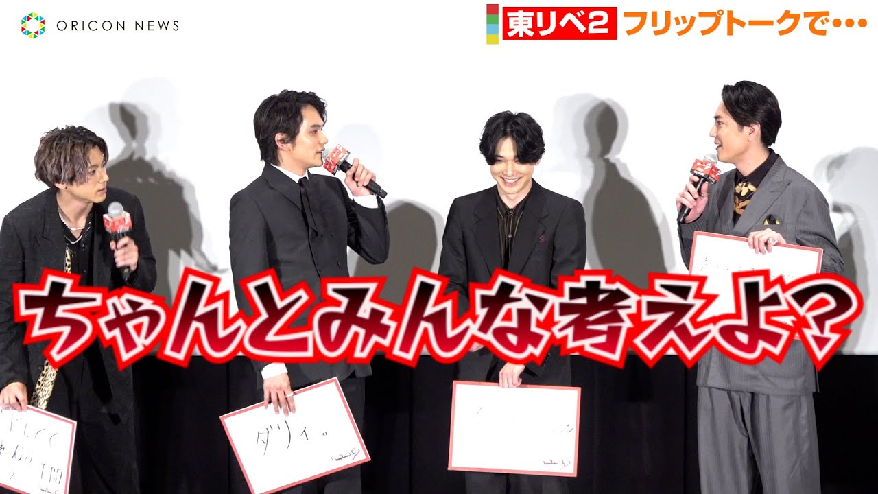 舞台あいさつでは、『東リベ2』の好きなせりふをフリップに記入して話すことに。吉沢が「いろんな名言があるんですけど、1つに絞るなら、これ…」と見せたフリップに書かれていたのは「右っていいよね」だった。思わぬチョイスに崩れ落ちた北村は「こんなに『東リベ』の主人公のタケミチで頑張った。タケミチのせりふ、みんな選ばないなと思っていたら、これ?」とボヤいた。
