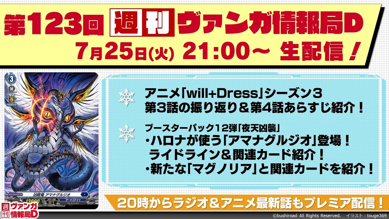 毎週火曜21時より、週刊ヴァンガ情報局D、略して #週ヴァン をお送りします!■出演■ ※敬称略 MC:#真野拓実 、 #進藤あまね ■番組内容 「週刊ヴァンガ情報局D」とは? アニメに関するお話や、最新カード情報、イベント情報など、「カードファイト!! ヴァンガード」のあらゆる最新情報をお届けする番組! ひと足早く、ヴァンガードの最新情報をゲットしよう! ヴァンガードファイター必見の番組です!#ヴァンガード #ウィルドレス #VGD #生配信 #TCG overDressTCGVanguardVGVGDアニメヴァンガヴァンガードオーバードレスカードゲームカードファイト!! ヴァンガード will+Dressブシロードホビー