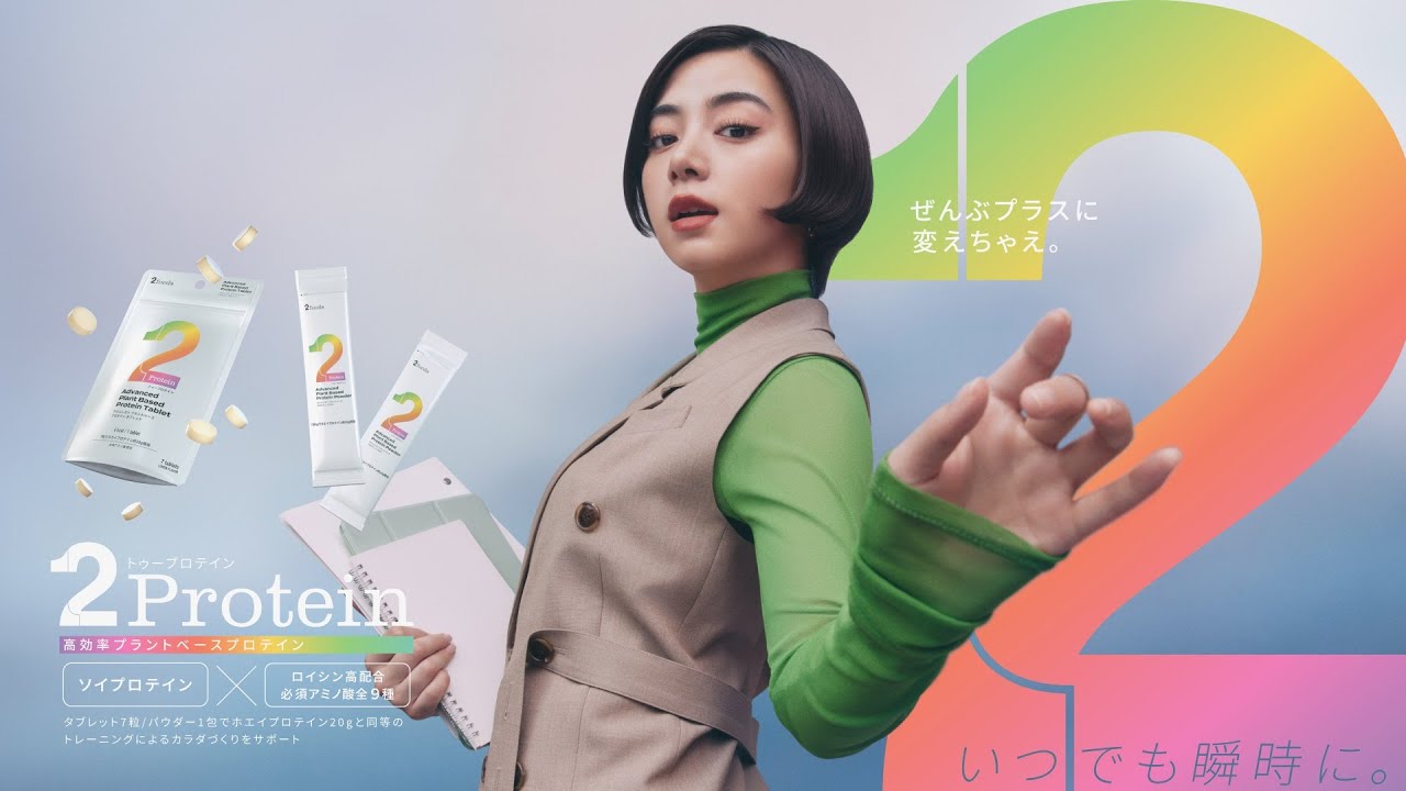 TVCMは、池田がオフィスでエレベーターを待つシーンから始まる。エレベーターが開いた瞬間、その中にはすでにぎゅうぎゅうに人が。エレベーターに乗れない池田は、2Proteinのタブレットをパクり。「ぜんぶプラスに変えちゃえ。」の言葉をきっかけに、ちょっとした時間に片足上げ運動を。到着したエレベーターに乗った池田はどこか満足気な顔。2Proteinと一緒であれば日常のちょっとしたスキマ時間をもプラスに変えてしまう、そんなポジティブでカラフルな世界観が表現されている。