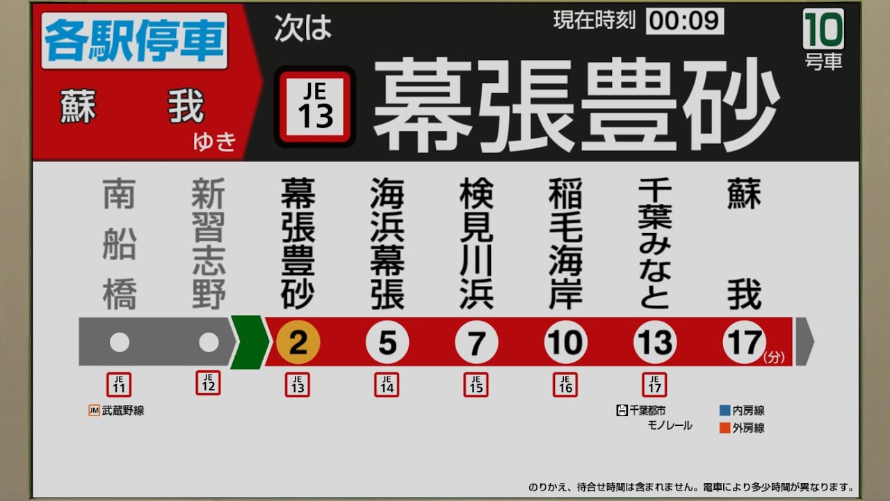 ※東京~新習志野駅間は2022年に収録した音声(下記動画の音声と同一)です。幕張豊砂~蘇我駅間のみ2023年3月18日(幕張豊砂駅開業日)に再収録を行い、1つの動画にまとめました。