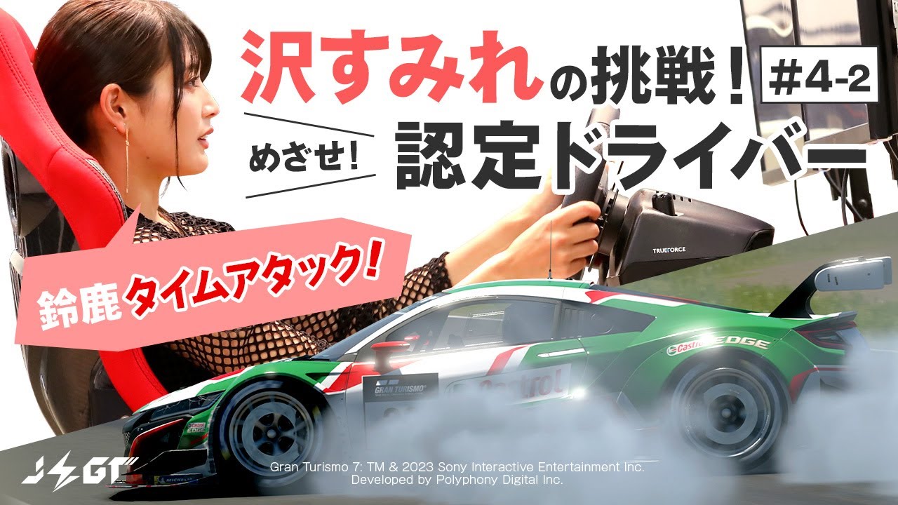JEGTアシスタントMC 沢すみれの挑戦企画!日本のトップドライバーである山中選手の解説と練習に続き、グランツーリスモ初心者の沢さんによる鈴鹿フルコースのタイムアタックです。