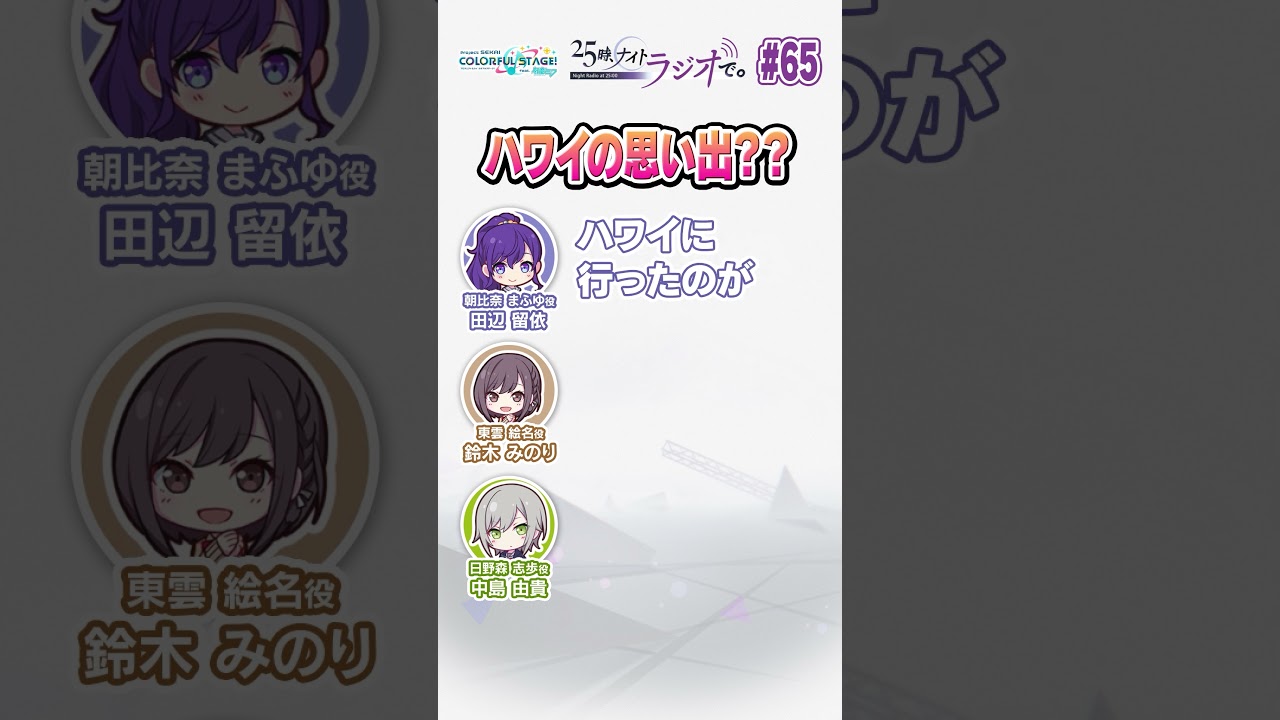 2023年4月16日(日)に公開された『25時、ナイトラジオで。 #65』のショート動画です。今回は 田辺留依さんのハワイの思い出について!