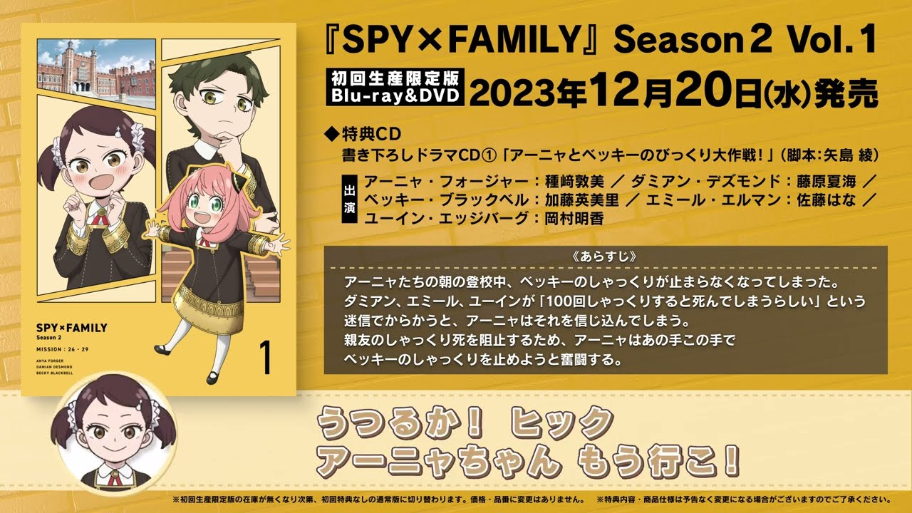 TVアニメ『SPY×FAMILY』Season 2 Blu-ray&DVD Vol.1 初回生産限定版特典、書き下ろしドラマCD①「アーニャとベッキーのびっくり大作戦!」の試聴動画を公開!