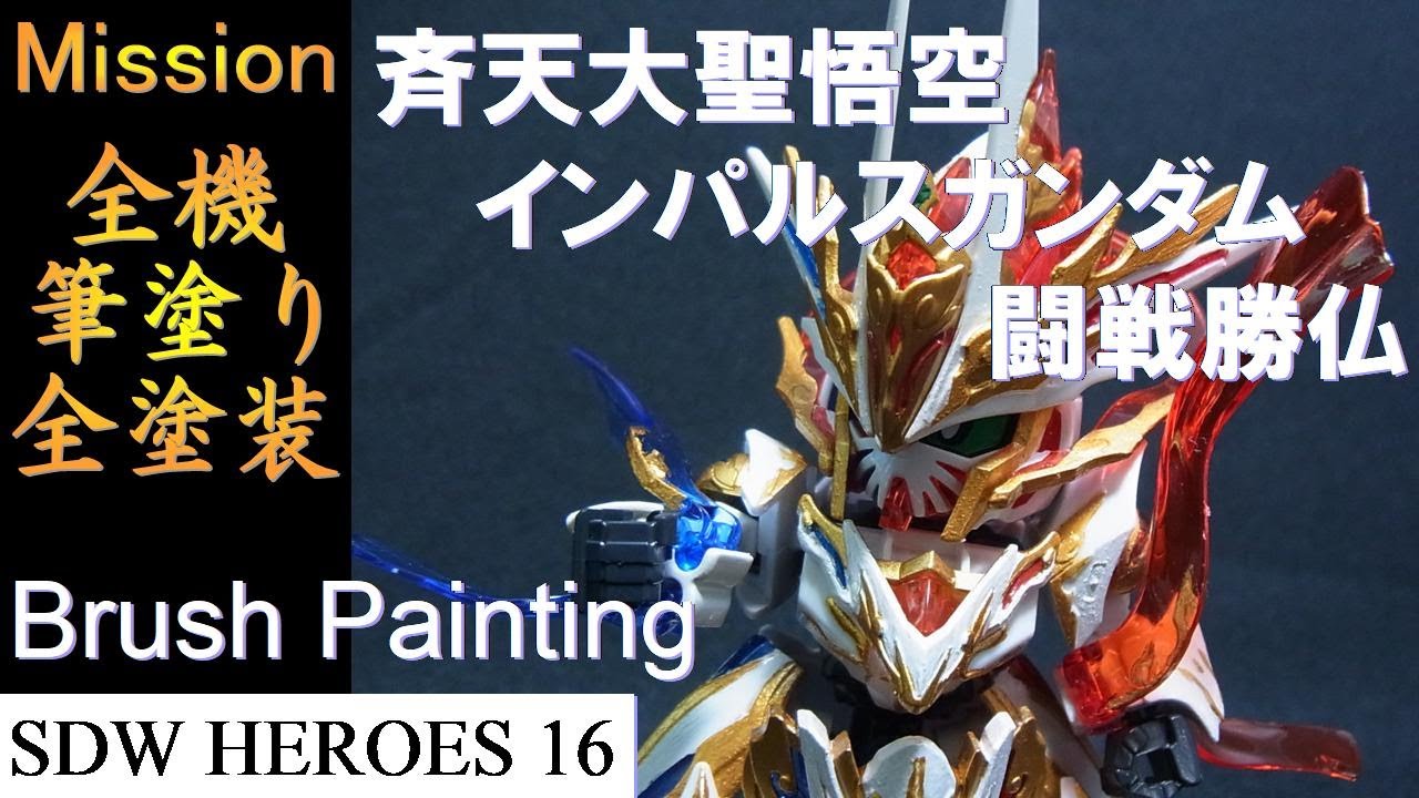SDガンダム、SDW HEROESを全機筆塗りします。今回は斉天大聖悟空インパルスガンダム-闘戦勝仏-です。悟空インパルスの最終の姿で夢天逢衣(むてんほうい)という悟空、沙悟浄、猪八戒3人の力を秘めた形態です。