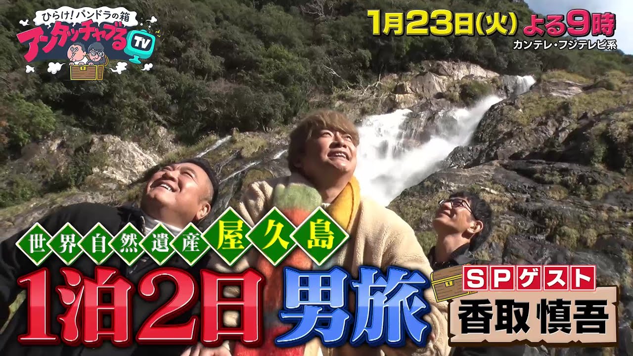 1月23日(火)の放送は、スペシャルゲスト・香取慎吾が参戦!世界遺産・屋久島で、知られざる不思議を大調査!アンタッチャブル×香取慎吾、屋久島街ブラロケを敢行!島民しか知らないような、ガイドブック超え!?の情報が!知られざる絶景スポットや絶品ローカルグルメなど屋久島の未知なる魅力に男3人大興奮!さらに!香取慎吾がアンタッチャブルに聞きたかったこと、ふと真面目な話へ。あの時の心境を語る、ホンネトークも見逃すな!