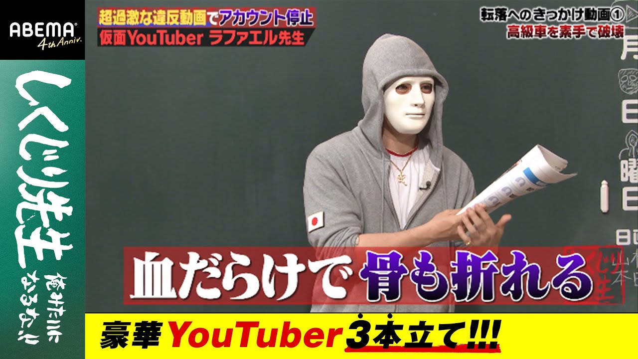 豪華YouTuber3本立てスペシャル!!前回に引き続き、正体不明の仮面YouTuberラファエル後半戦!YouTubeを始めて1年でトップYouTuberの仲間入りを果たしたラファエル先生。しかし、過激な動画をあげまくっていたせいでアカウントが緊急停止することに…。一瞬にして登録者がゼロになり、数千万円の損失で無収入生活に陥ってしまったと告白。そんなドン底の状態から再び登録者数を増やしていると予期せぬ出来事が?!アカウント停止のしくじりから学んだ教訓は必見です!