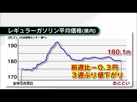 石油情報センターによりますと昨日時点の 県内のレギュラーガソリンの平均販売価格 は1Lあたり 180.144.の値下がりとなりました 3週ぶりの値下がり です石油情報センターは原油価格が一時的 に値下がりした来週は小幅な値上がりに なると見られると話しています