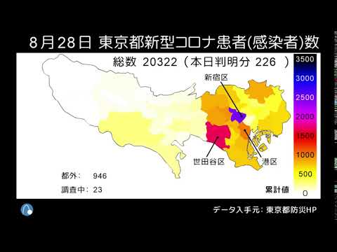 東京都の新型コロナ患者数(感染者数)マップの動画を毎晩更新中。報道される『感染者数』とは、実際には、陽性判定の人数『患者数』です。8/29時点で累計20,569人となります。このマップも患者数であり、本来の感染者数とは異なりますが、拡大傾向を把握できます。 データは、東京都防災ホームページ『東京都新型コロナウイルス感染症対策本部報』の区市町村別患者数(都内発生分)から取得しました。最新のマップはこちらでも見られます: COVID-19NewsVideoコロナマップ地図患者数感染者数新型コロナウイルス感染症東京東京都新型コロナウイルス患者数感染者数マップ