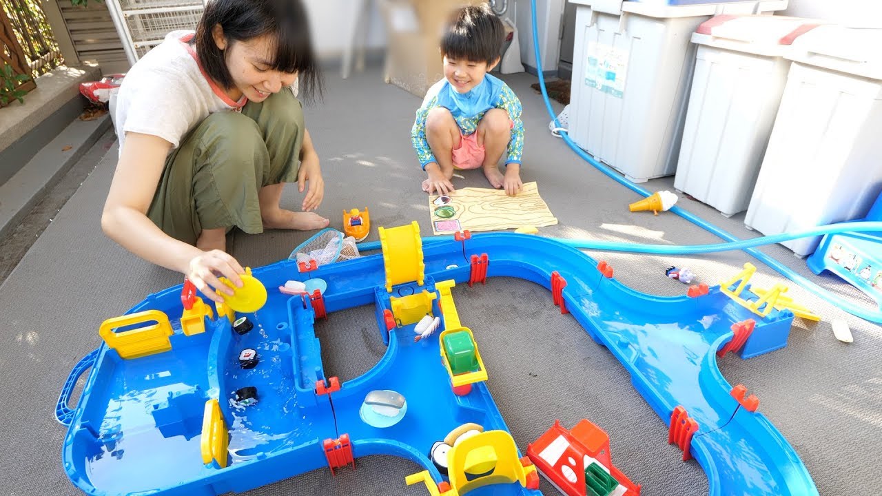 息子ひたちの誕生日プレゼントでもらった「アクアプレイ」で遊びました。今回は水の温度で色が変わる「まほうのお寿司」を流して遊びましたが、他にもいろいろ水に流して遊べそうです。