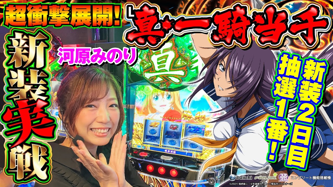 7が揃いまくる「セブンラッシュ」、ボーナス超高確率の上位AT「(真)昇龍モード」、ツラヌキ要素「趙雲ループ」などなど爆裂要素満載で稼働絶好調の新台「L真・一騎当千」(大一商会)を河原みのりが新装実戦!! 新装2日目の熾烈な抽選からみのりん史上レアな展開が待ち受ける!!