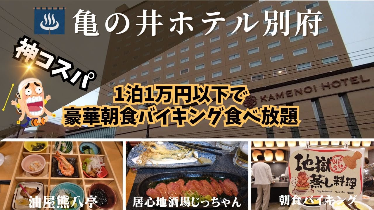 今回は大分県旅行で別府温泉にある亀の井ホテル別府に宿泊しました。 1人1万円以下の9800円で豪華朝食バイキング食べ放題の神コスパのお宿です。ホテルは繁華街にあるので夕食は館内にある油屋熊八亭の和食亭と繁華街にある居心地酒場じっちゃんの2カ所を紹介します。